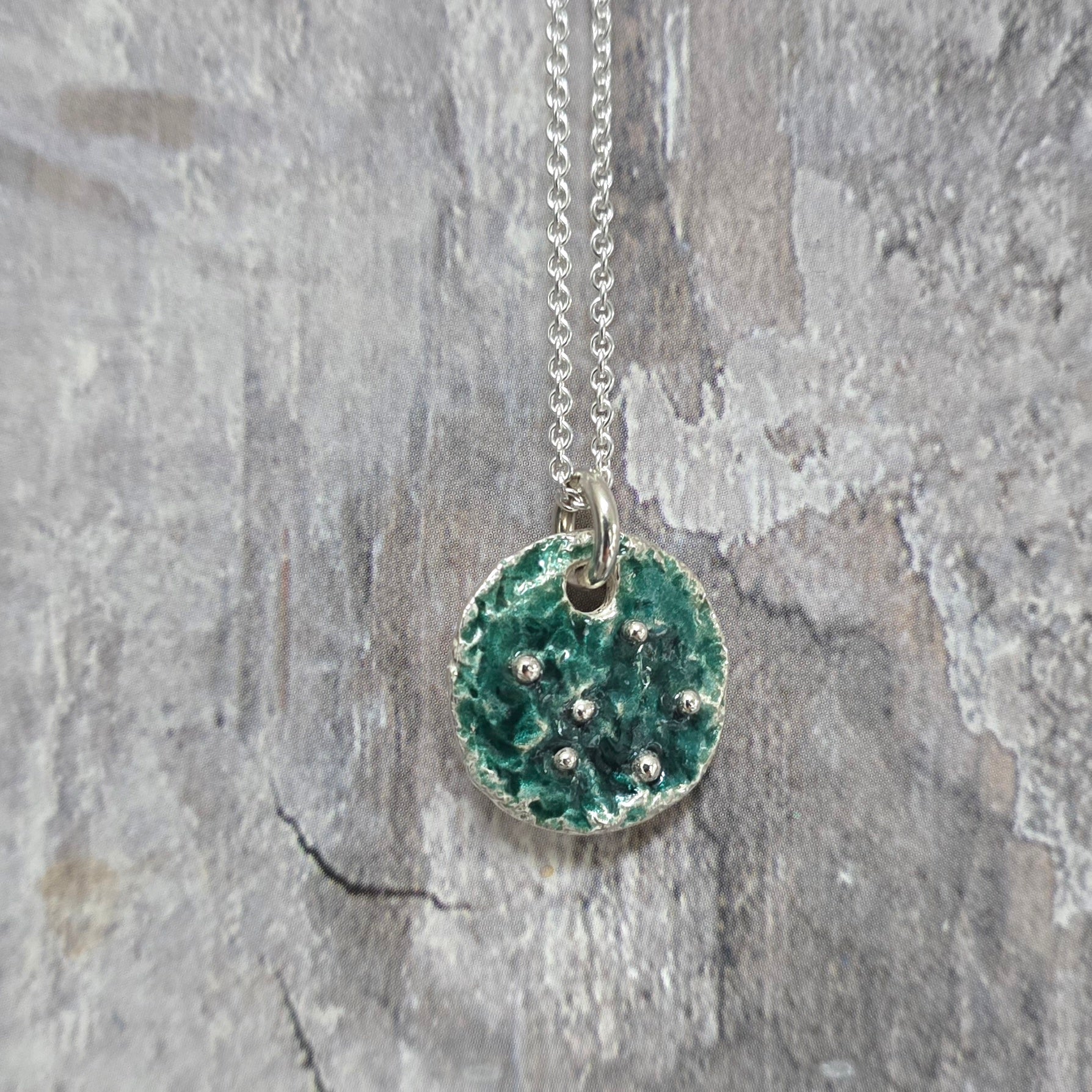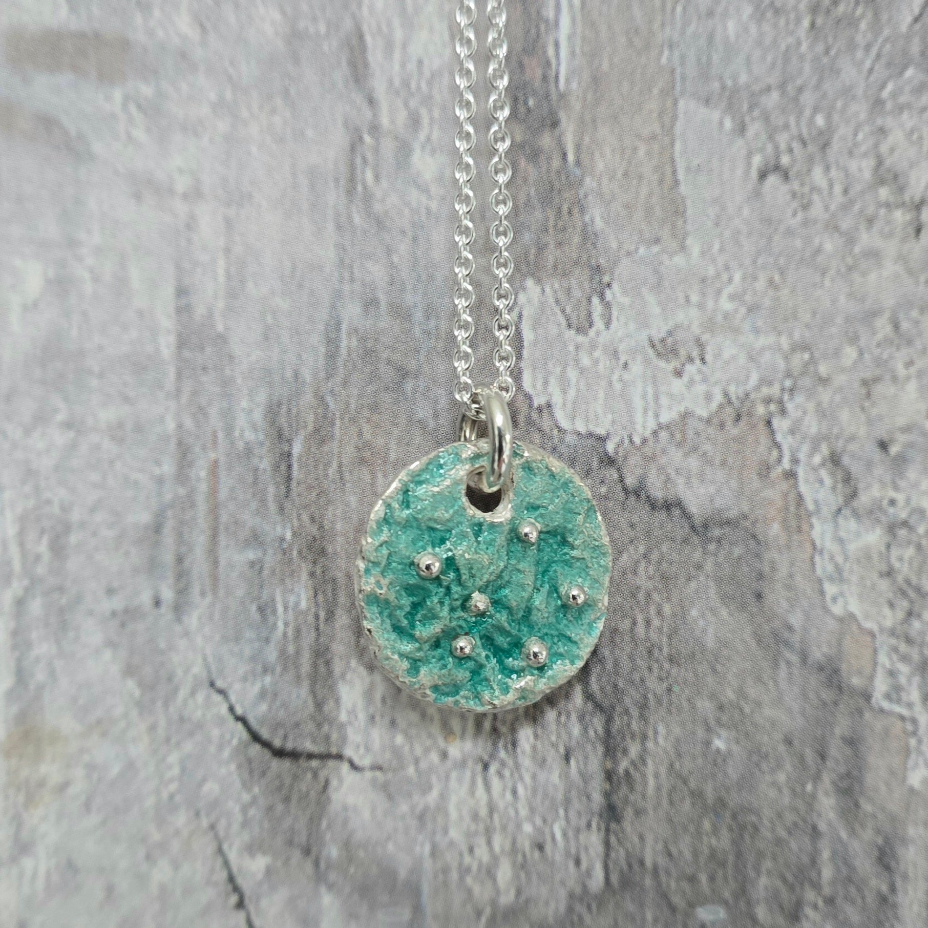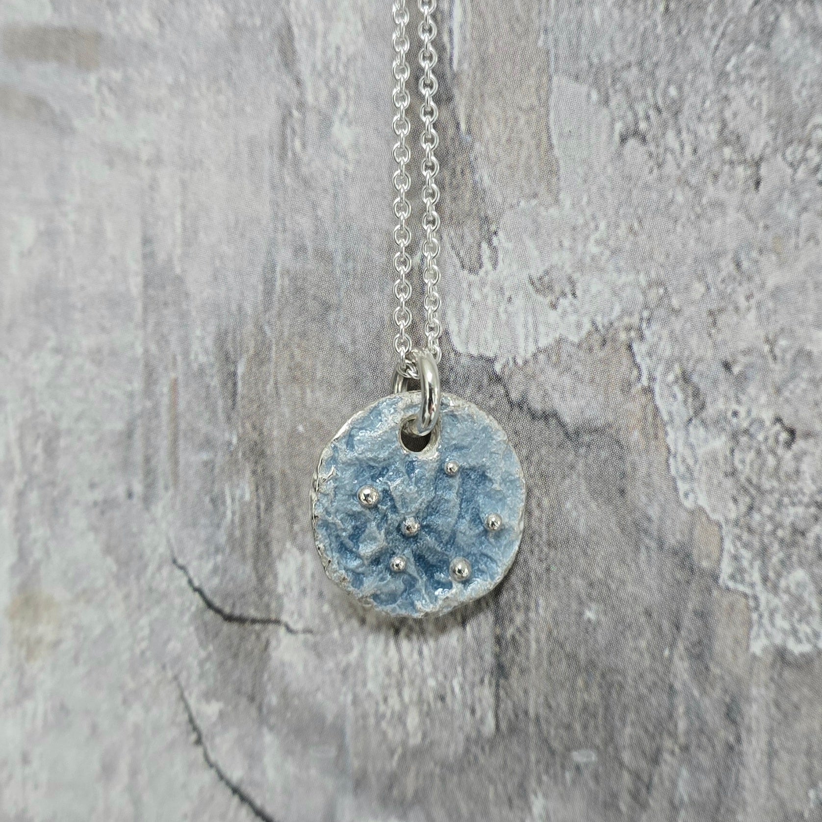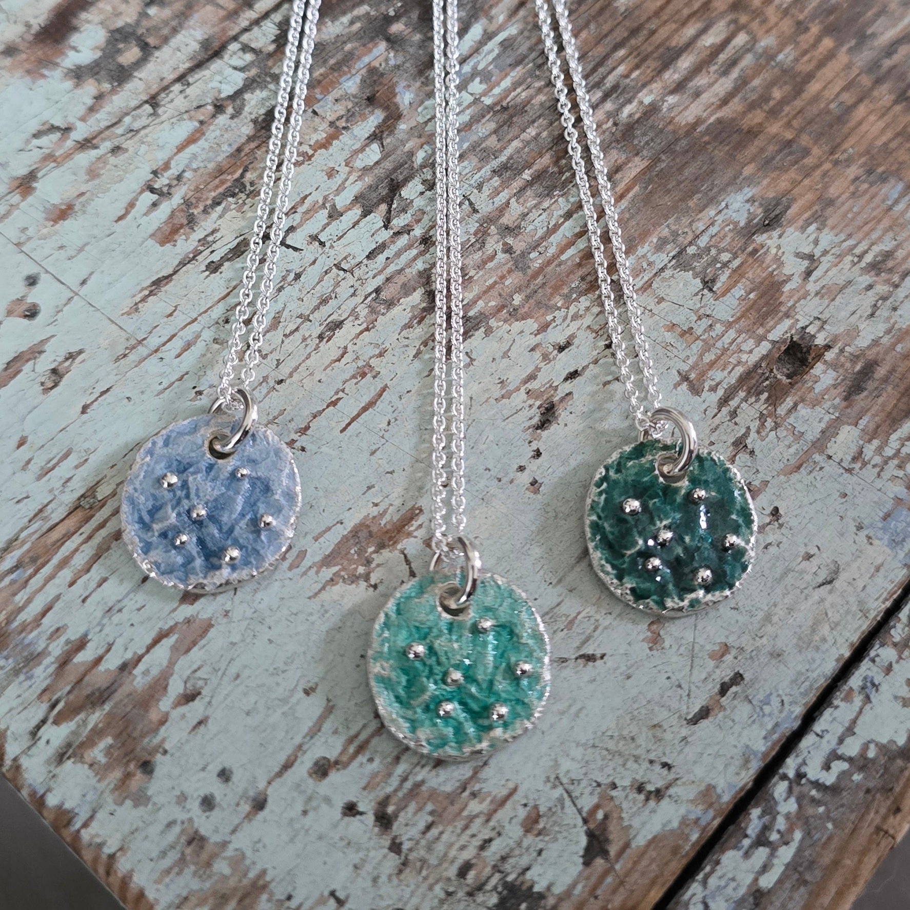 Emaljen framhevar sølvdropane og er med å gjere kvart eit smykke unikt, såleis får alle eit eige uttrykk og difor kan smykket du får avvike noko frå bildet. Kjede i regulerbar lengde 45/50 cm er inkludert i prisen, ta kontakt om du ønskjer ei anna lengde.