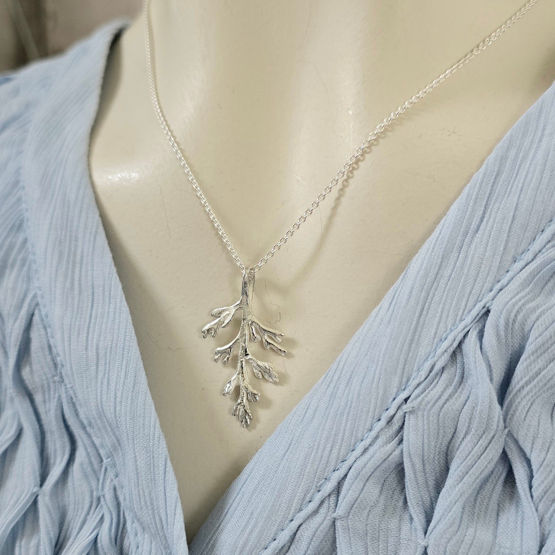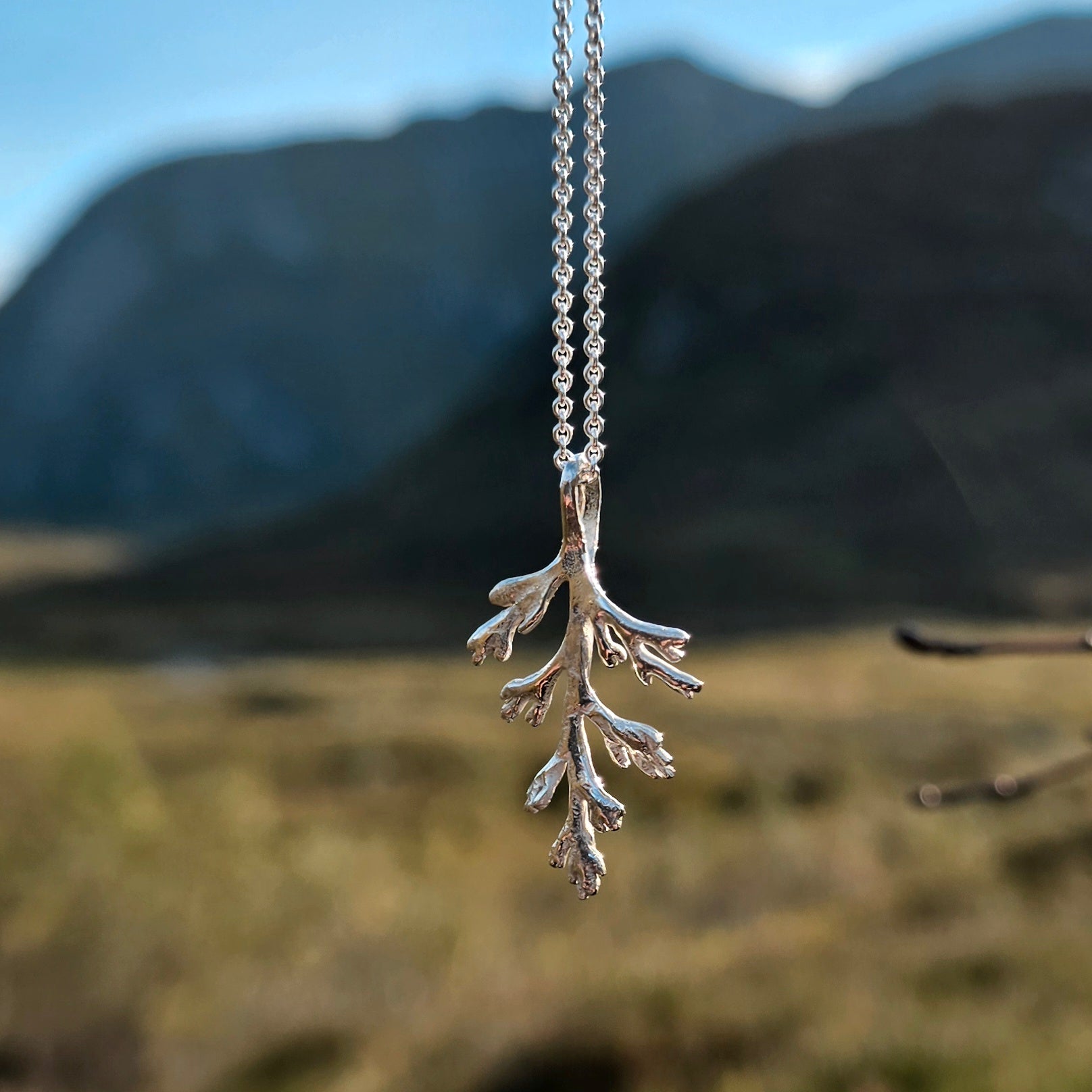 Fjellflora-serien har fått ny overflate. Alle blir ulike og unike. Kjede i regulerbar lengde 42/45 cm er inkludert i prisen, ta kontakt om du ønskjer ei anna lengde.