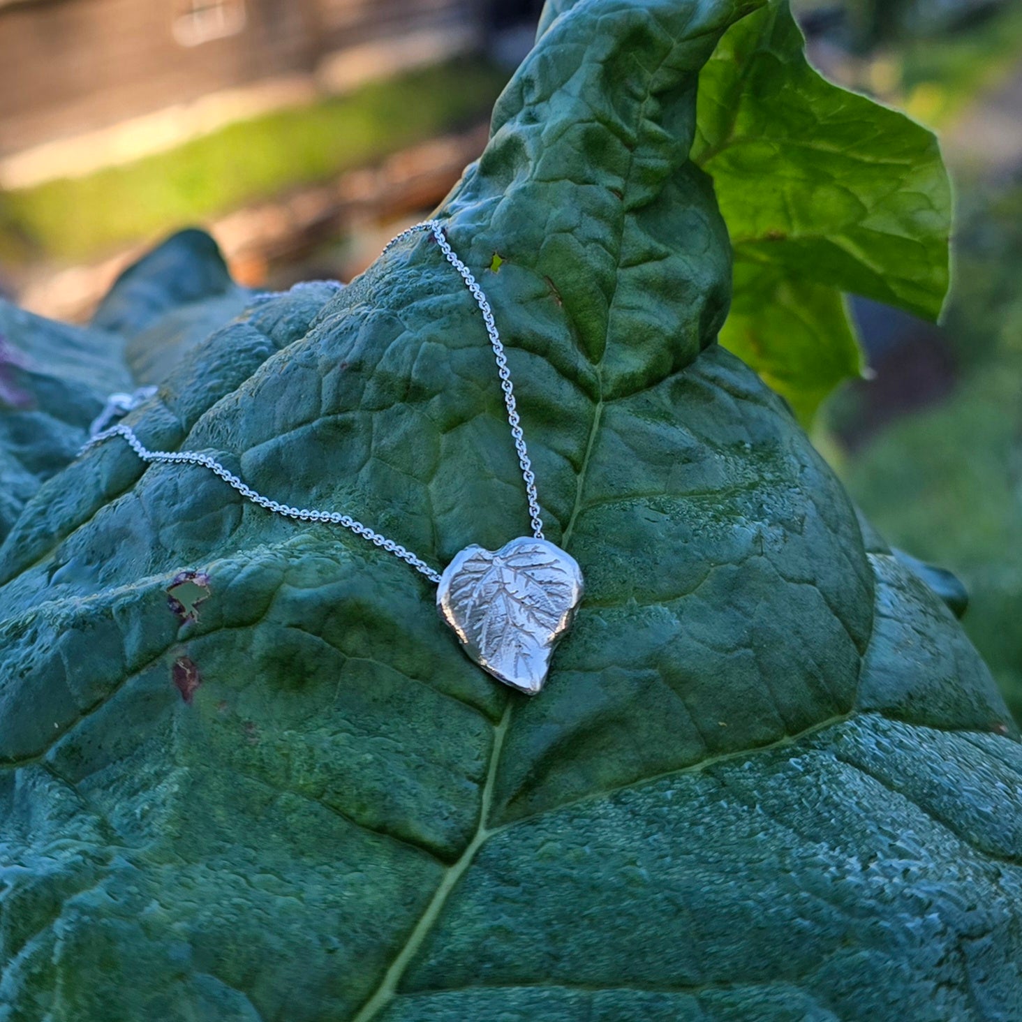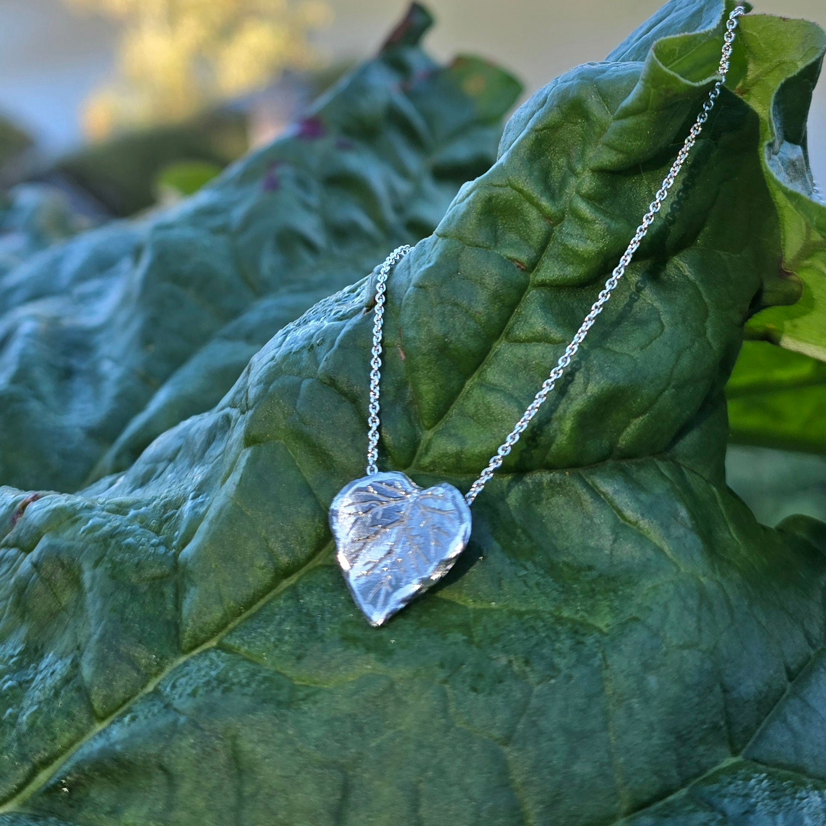Fint rabarbrablad med hemper til kjede på bakside. Kjede i regulerbar lengde 45 cm er inkuldert i prisen.