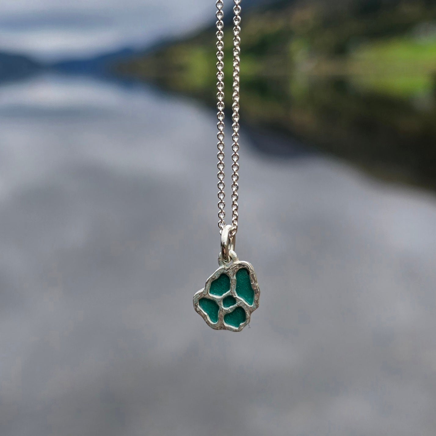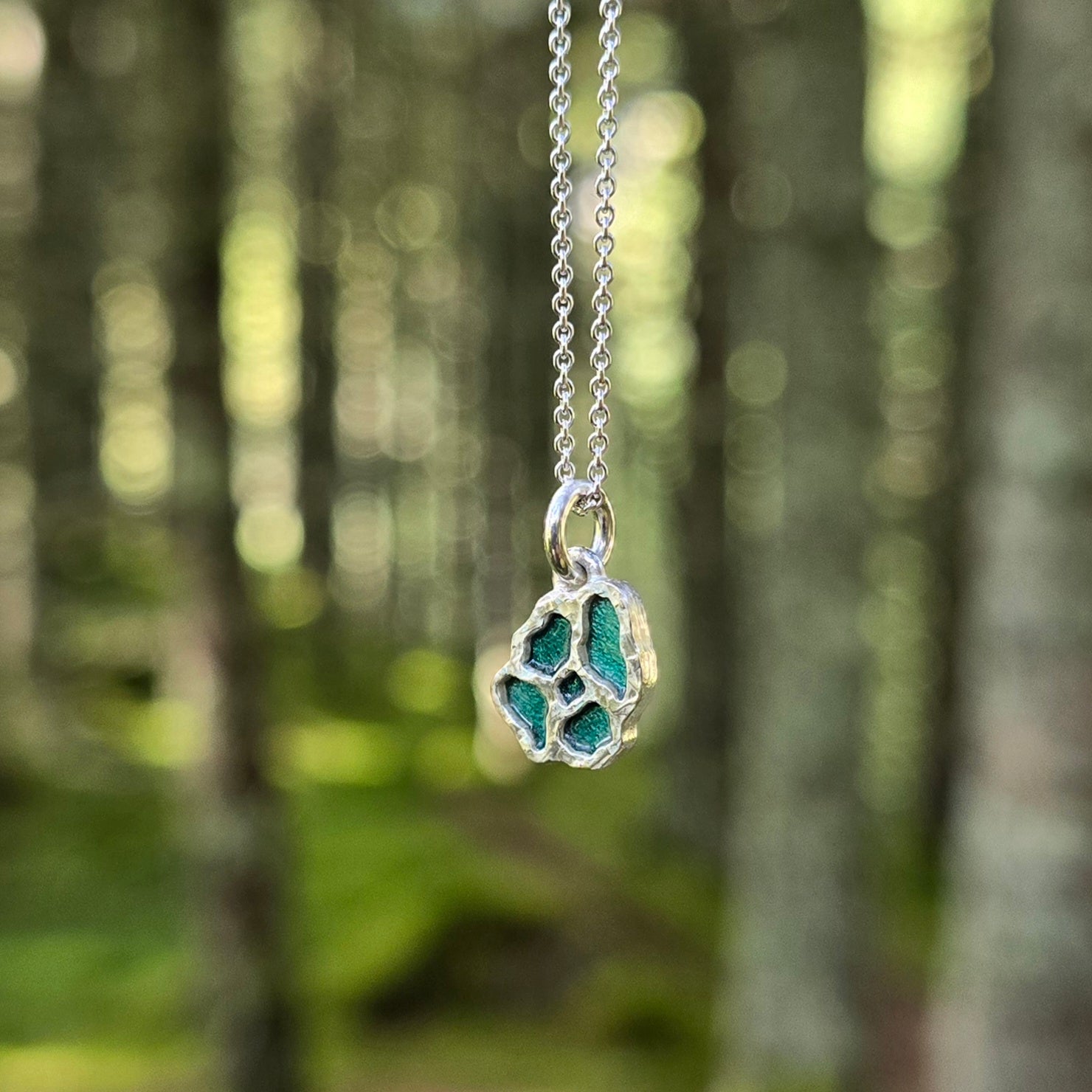 Fint og tidlaust halssmykke i Valmueserien. Emaljefargen har fått namnet skog. Gjer oppmerksom på at fargen frå smykke til smykke kan variere då det er mykje som påverkar korleis det endelege resultatet blir.